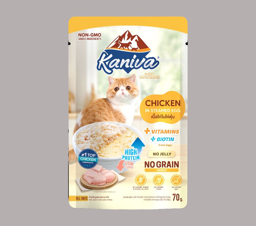 Kaniva believes that every cat deserves to be healthy inside and out! We craftily selected every single ingredient to ensure that. Kaniva is produced as a complementary cat food. Created with a determination to satisfy your cat’s unique needs, Kaniva pouch has no added grain, corn, wheat, wheat gluten and Salt. Every bite features real Meat and Eggs as the prime ingredient added into steamed egg. In the end, with a bowlful of Kaniva, your cats will be more than ready to ‘meow’.