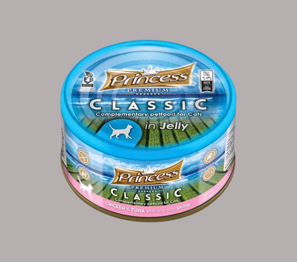 This premium recipe combines 23.27% chicken and 23.27% tuna with a luxurious shrimp topping for a protein-rich and flavorful meal. Sunflower oil supports a shiny coat and healthy skin, while the jelly solution ensures a smooth texture and enhanced palatability. Rice adds gentle digestive support, and essential minerals such as tricalcium phosphate and potassium chloride contribute to bone health and overall nutrition.