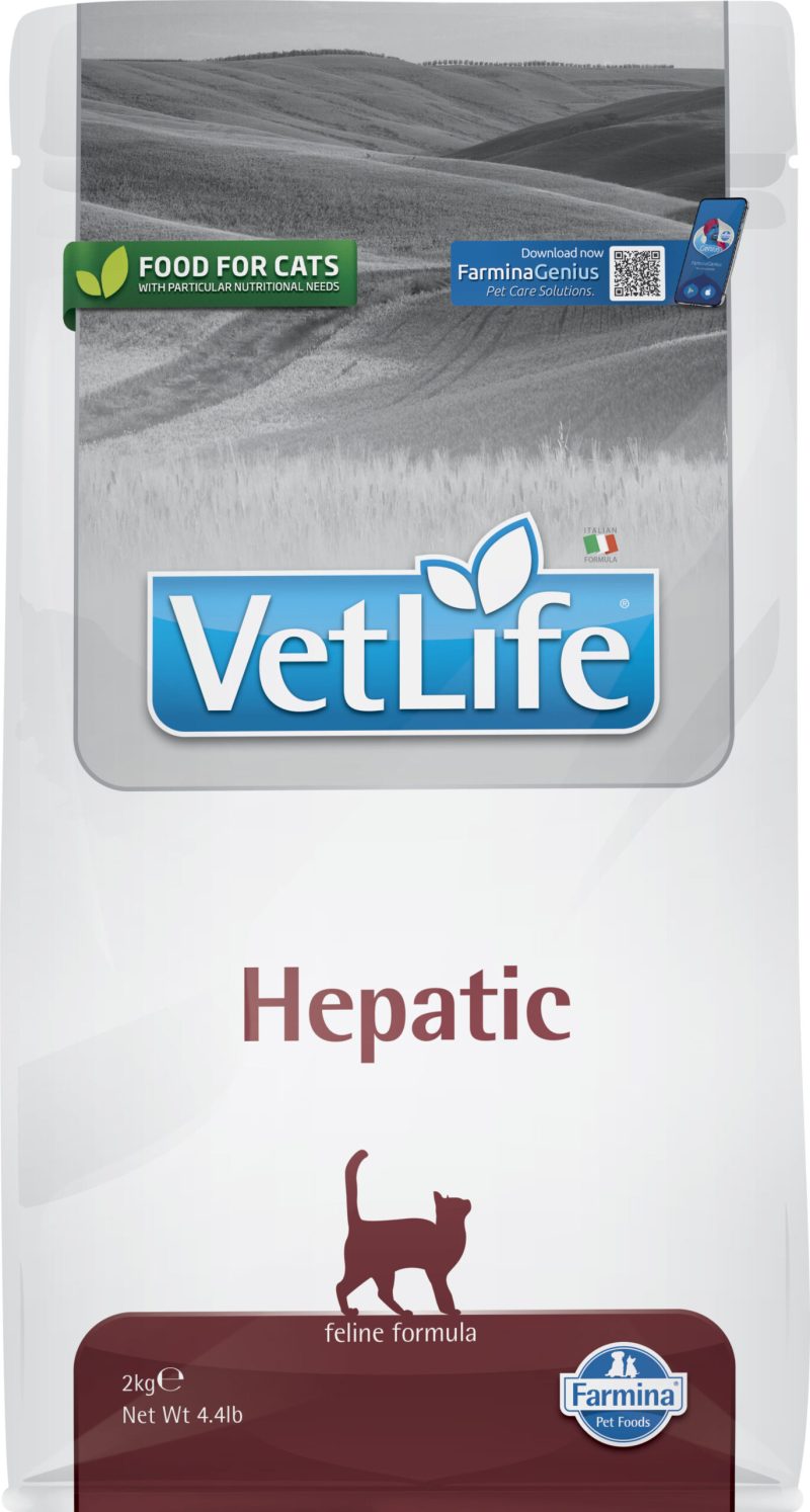 Support liver function in the case of chronic liver insufficiency. Farmina Vet Life Hepatic is a complete feed for cats, indicated for the support of hepatic functionality in case of chronic hepatic insufficiency. This aliment has a moderate concentration of high quality protein, a high concentration of essential fatty acids and a high concentration of digestible carbohydrates.