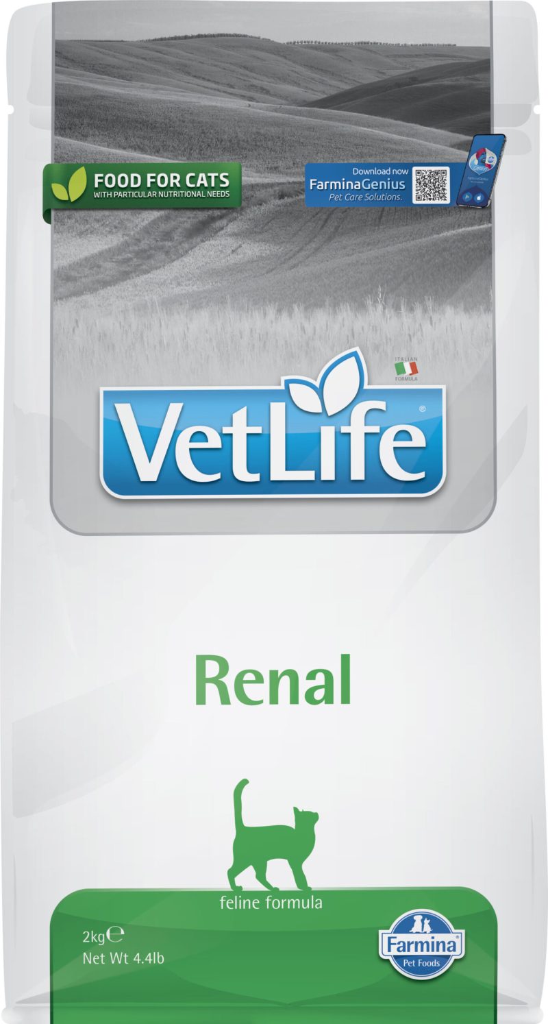 Chronic or temporary renal insufficiency; coadjuvant for the treatment of congestive cardiac insufficiency. Farmina Vet Life Renal is a complete dietetic food for cats formulated to support the renal function in case of chronic or temporary renal insufficiency. This dietetic food contains low phosphorus concentrations and reduced protein content but of high quality.