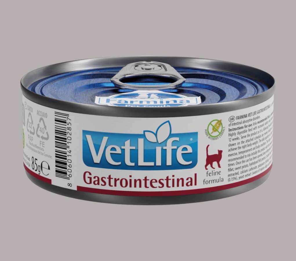 Farmina Vet Life Gastrointestinal is a complete dietetic food for cats formulated to reduce acute intestinal absorption disorders. It favors recovery nutrition and convalescence thanks to the increased level of electrolytes and to a highly digestible ingredients. Instruction for use: it is recommended that a veterinarian’s opinion be sought before use and before extending the period of use. Serve the product as it is, at room temperature, following the daily quantity indicated in the table. Recommended period of use: from 1 to 2 weeks in case of reduction of acute disorders of intestinal absorption; from 3 to 12 weeks in case of bad digestion compensation; during acute diarrhea and following periods of convalescence, for all life in case of chronic pancreatic insufficiency. Always leave plenty of fresh water.